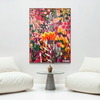 This contemporary botanical artwork features a richly layered composition of abstract florals, foliage, and graphic pattern, creating a vibrant, immersive garden scene. Hand-painted using expressive brushstrokes and bold colour contrasts, the piece combines pinks, reds, oranges, greens, and black-and-white detailing to bring energy and depth to the surface. Organic shapes and repeated motifs guide the eye through the artwork, giving it a sense of movement, abundance, and visual rhythm. Designed for modern interiors, this original abstract botanical painting adds warmth, personality, and a strong focal point to living spaces, dining rooms, and creative environments.
