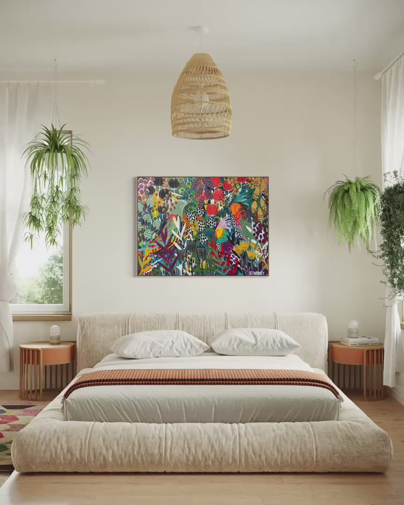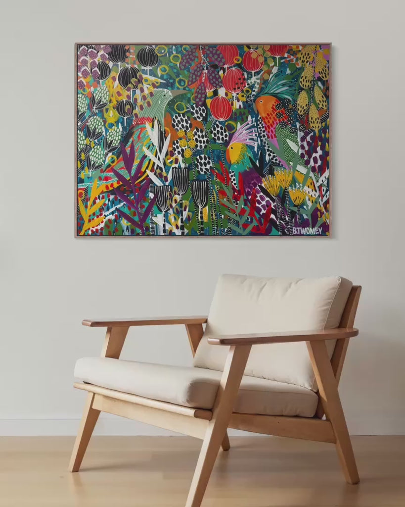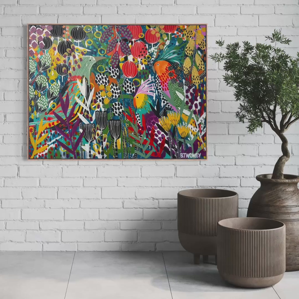 This bold abstract botanical artwork bursts with colour, rhythm and playful detail, unfolding like a vibrant garden alive with movement and song. Stylised birds weave through layers of lush foliage, seed pods and sculptural blooms, their bright forms adding energy and narrative to the composition. Saturated blues, emerald greens, fiery reds and golden yellows collide with graphic line work, dotted textures and expressive brushstrokes, creating a richly immersive surface that invites exploration. Joyful, confident and contemporary, this artwork brings vitality, warmth and a sense of animated life to a space, making it a striking statement for interiors that embrace colour and creativity.