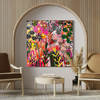 This contemporary abstract botanical painting is a bold celebration of colour, pattern, and expressive mark-making. Layered florals, seed pods, and foliage intertwine across the surface, creating a vibrant, immersive garden scene full of movement and visual rhythm. Bright pinks, oranges, yellows, greens, and black-and-white detailing work together to create contrast, depth, and a strong sense of energy without feeling chaotic. Painted intuitively yet with clear structure, this original artwork brings warmth, personality, and a confident focal point to modern interiors, making it ideal for living spaces, dining rooms, and creative environments.
