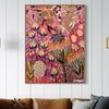 This piece hums with warmth and memory — layers of fuchsia, ochre, rust and sienna drift together like something half-remembered. With organic forms and gestural drips, it evokes seedpods, earth textures, and botanical silhouettes, as if glimpsed through a softened lens. There’s a sense of quiet movement here, a grounded beauty that feels both ancient and alive.